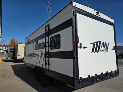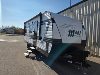 MAV stands for Momentum Adventure Vehicle, and you will surely have grand adventures in this one. The Strong Wall aluminum construction is 25% thicker than the competition and the double insulated roof is ultra durable. Thoughtful design touches make life easier, like the magnetic storage door catches and the lack of wheel wells in the garage, which gives you full use of the cargo area. Inside you'll find solid hardwood drawer fronts, residential countertops, and a solid bedroom door. The Solar Package provides off-grid capabilities with a 180W solar panel, 12V refrigerator, battery monitor, and 40 Amp charge controller with Bluetooth!