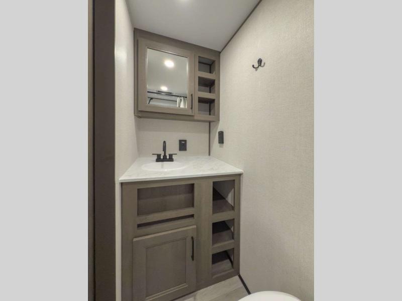 Each model is constructed to a superior standard with an insulated floor and enclosed underbelly plus residential insulated walls that will help with temperature regulation and moisture control. The 6' 6" interior height, tinted windows, and residential cabinet doors will make your space feel a little more like home, and the black automotive glass entry door is ultra sleek. You will find a power awning with a Fusion light outside, along with magnetic storage door catches, a Leash Link/bottle opener, and more convenient features!