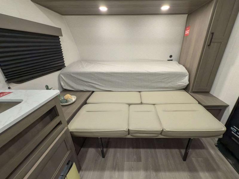 Sleeps 7 Slides 1 Length 23 ft Ext Width 8 ft Ext Height 10 ft 6 in Int Height 6 ft 6 in Hitch Weight 524 lbs GVWR 5500 lbs Dry Weight 4784 lbs Fresh Water Capacity 37 gals Grey Water Capacity 74 gals Black Water Capacity 37 gals Tire Size ST225/75R15LRE Furnace BTU 20000 btu Number Of Bunks 2 Available Beds Queen Murphy Bed Refrigerator Type Glass Front 12V Refrigerator Size 10 cu ft Cooktop Burners 2 Shower Size 27" x 36" Number of Awnings 1 LP Tank Capacity 20 lbs Water Heater Capacity 6 gal Water Heater Type Gas/Electric AC BTU 13500 btu Awning Info 16' Power w/Fusion Light Axle Count 1 Number of LP Tanks 1 Shower Type Walk-In Shower Similar Floorplans