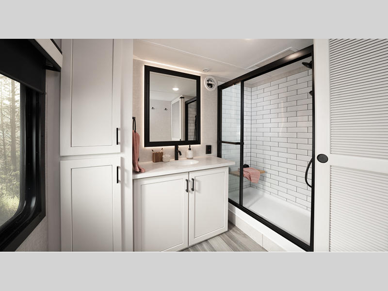 Durable construction begins with 12 inch I-Class cambered structural steel I-beams, a Magnum Truss roof system, and 5/8 inch tongue-and-groove plywood floor decking. You will appreciate the axles with electric, self-adjusting brakes and E-Z Lube hubs for smooth towing, and the insulated and enclosed underbelly within the Thermal Package will help extend your camping season. The interior will feel more like a home with hardwood look vinyl flooring, an electric fireplace, tall doorways and ceiling heights, and many more comforts.
