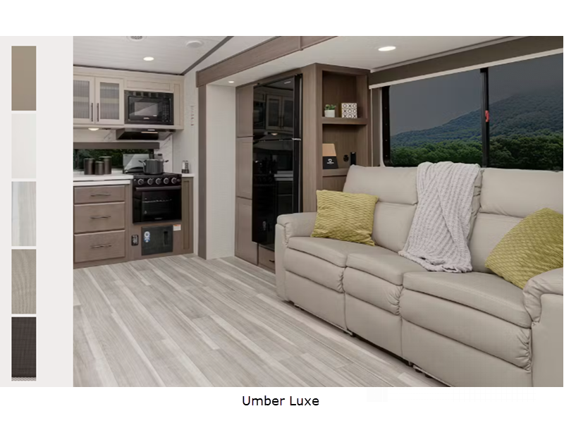 Sleeps 5 Slides 2 Length 30 ft 10 in Ext Height 12 ft 7 in Interior Color Umber Luxe Hitch Weight 1715 lbs Dry Weight 9200 lbs Cargo Capacity 1800 lbs Fresh Water Capacity 54 gals Grey Water Capacity 60 gals Black Water Capacity 30 gals Tire Size ST225/75R15E Furnace BTU 30000 btu Available Beds King Refrigerator Type 12V Refrigerator Size 10.4 cu ft Cooktop Burners 3 Number of Awnings 2 LP Tank Capacity 30 lbs Water Heater Type Tankless On Demand AC BTU 18000 btu TV Info LR LED HDTV Awning Info 9' and 10' Electric w/ Gas Strut Arm w/Dotless Neon Lighting Axle Count 2 Washer/Dryer Available Yes Number of LP Tanks 2 Shower Type Standard Electrical Service 50 amp Similar Floorplans