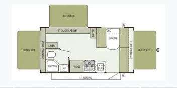 13,500-BTU A/C with wall thermostat 18,000-BTU furnace with auto-ignition ABS tub surround Ball bearing drawer guides, 50-lb. capacity with full-drawer extension Bathroom exhaust fan Bourbon Glaze beech wood doors and drawers throughout Cable and satellite TV prepped High-density foam cushions LED light in bunk area Pleated shades Porcelain toilet with foot flush Privacy curtains for bunks Queen bed-sized quilted bunk mats (2) Stereo with MP3 input jack and 2 speakers Systems monitor panel Tub/shower skylight Vanity mirror in bathroom Water heater bypass system Winterization kit